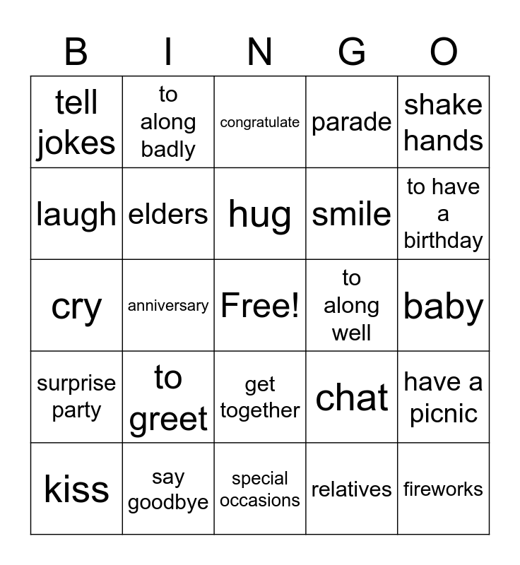 This bingo card has a free space and 24 words: to greet, say goodbye, hug, kiss, shake hands, tell jokes, laugh, to along badly, to along well, get together, smile, cry, chat, have a picnic, elders, relatives, baby, congratulate, to have a birthday, anniversary, fireworks, surprise party, parade and special occasions.