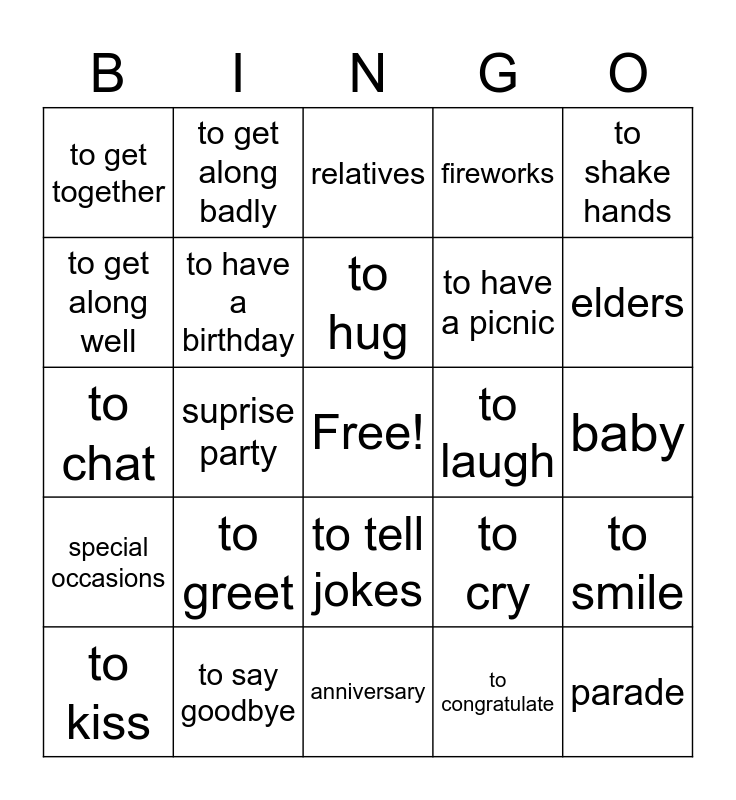 This bingo card has a free space and 24 words: to greet, to say goodbye, to hug, to kiss, to shake hands, to get together, to get along well, to get along badly, to laugh, to tell jokes, to have a picnic, to chat, to cry, to smile, to have a birthday, to congratulate, baby, relatives, elders, suprise party, parade, special occasions, fireworks and anniversary.