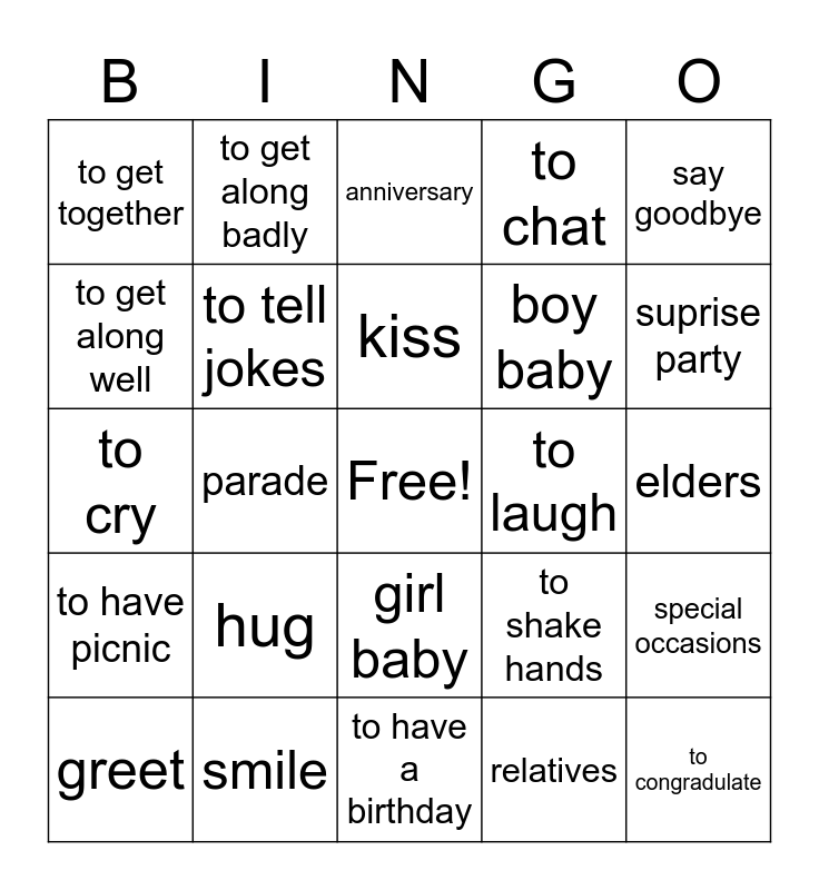 This bingo card has a free space and 24 words: hug, smile, kiss, greet, say goodbye, to get together, to get along well, to get along badly, to laugh, girl baby, boy baby, to cry, to shake hands, special occasions, to tell jokes, relatives, elders, anniversary, suprise party, parade, to congradulate, to have picnic, to chat and to have a birthday.