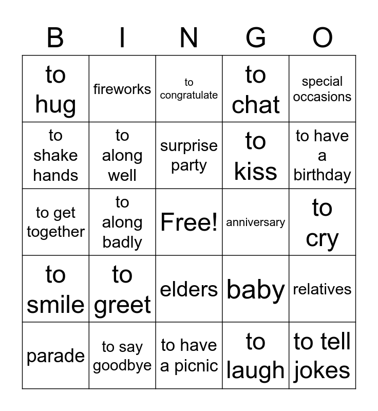 This bingo card has a free space and 24 words: to greet, to say goodbye, surprise party, parade, special occasions, to hug, to shake hands, fireworks, anniversary, elders, to kiss, to get together, baby, relatives, to along well, to laugh, to cry, to congratulate, to have a birthday, to along badly, to tell jokes, to smile, to chat and to have a picnic.