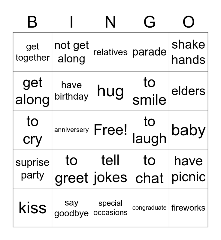 This bingo card has a free space and 24 words: to greet, say goodbye, hug, kiss, shake hands, get together, get along, not get along, to laugh, tell jokes, to smile, to cry, to chat, have picnic, have birthday, congraduate, baby, relatives, elders, anniversery, fireworks, suprise party, parade and special occasions.