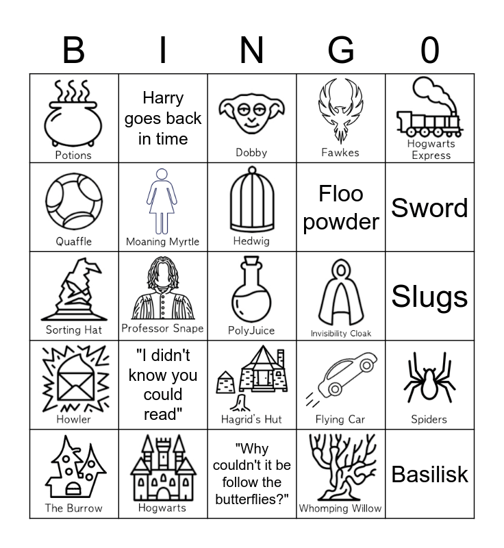 This bingo card has 25 images and 10 words: Sword, Basilisk, Harry speaks parseltongue, Floo powder, Slugs, Lucius Malfoy, "Why couldn't it be follow the butterflies?", "I didn't know you could read", Harry goes back in time and "Help will always be given at Hogwarts to those who ask for it".
