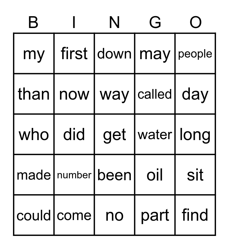 This bingo card has 25 words: number, no, way, could, people, my, than, first, water, been, called, who, oil, sit, now, find, long, down, day, did, get, come, made, may and part.