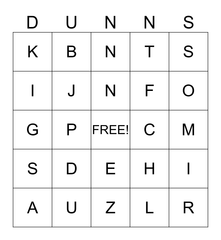 This bingo card has a free space and 24 words: D, U, N, A, S, K, I, B, C, E, F, G, H, I, J, L, M, N, O, P, R, S, T and Z.