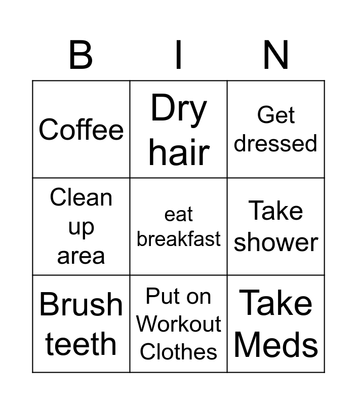 This bingo card has a free space and 8 words: Take shower, Get dressed, Dry hair, Brush teeth, Coffee, Take Meds, Clean up area and Put on Workout Clothes.