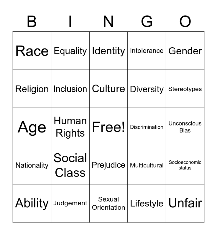 This bingo card has a free space and 25 words: Social Class, Sexual Orientation, Culture, Ability, Gender, Race, Religion, Equality, Discrimination, Prejudice, Diversity, Age, Multicultural, Socioeconomic status, Inclusion, Microaggression, Unconscious Bias, Identity, Stereotypes, Human Rights, Unfair, Judgement, Nationality, Intolerance and Lifestyle.