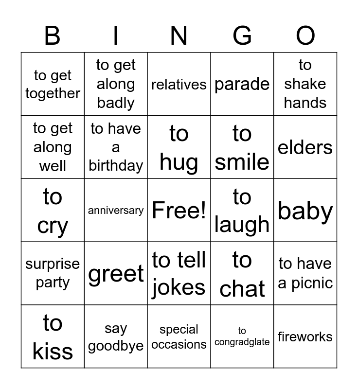 This bingo card has a free space and 24 words: greet, say goodbye, to hug, to kiss, to shake hands, to get together, to get along well, to get along badly, to laugh, to tell jokes, to smile, to cry, to chat, to have a picnic, to have a birthday, to congradglate, baby, relatives, elders, anniversary, fireworks, surprise party, parade and special occasions.