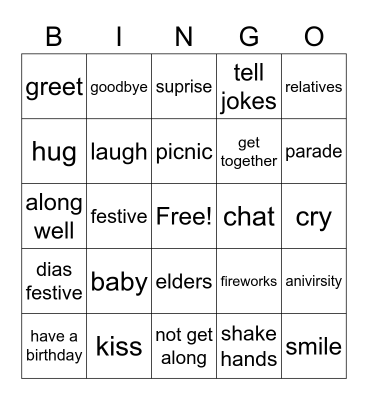 This bingo card has a free space and 24 words: baby, kiss, picnic, have a birthday, relatives, greet, hug, goodbye, chat, elders, get together, along well, fireworks, anivirsity, laugh, shake hands, cry, suprise, parade, festive, smile, dias festive, tell jokes and not get along.