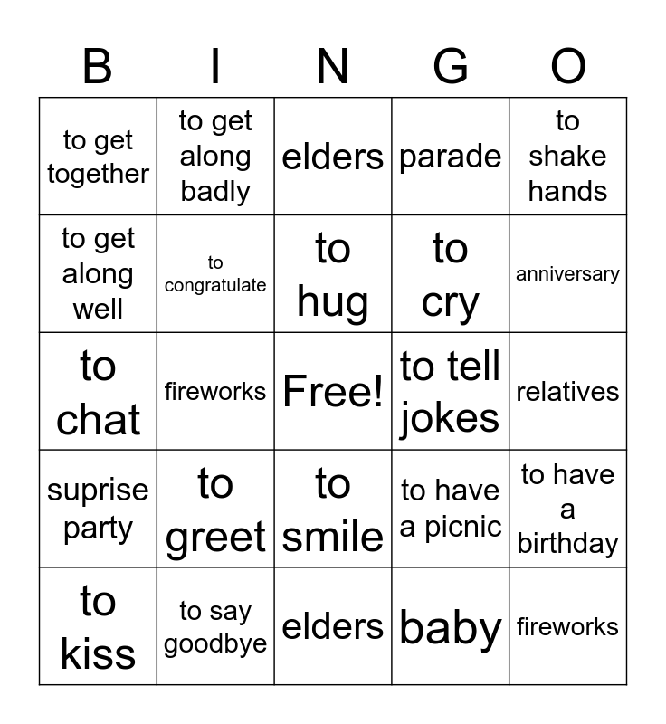 This bingo card has a free space and 24 words: to greet, to say goodbye, to hug, to kiss, to shake hands, to get together, to get along well, to get along badly, to tell jokes, to smile, to cry, to chat, to have a picnic, to have a birthday, to congratulate, baby, relatives, elders, anniversary, fireworks, fireworks, suprise party, parade and elders.