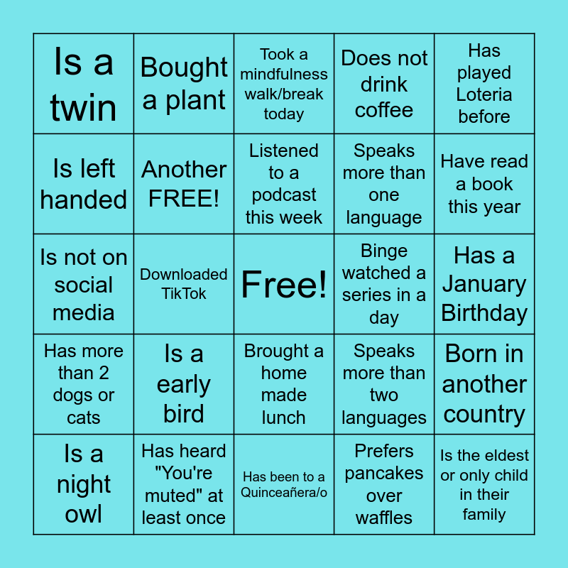 This bingo card has a free space and 24 words: Is a early bird, Has heard "You're muted" at least once, Listened to a podcast this week, Is a night owl, Has played Loteria before, Is a twin, Is left handed, Bought a plant, Binge watched a series in a day, Brought a home made lunch, Speaks more than one language, Is not on social media, Speaks more than two languages, Born in another country, Another FREE!, Prefers pancakes over waffles, Has a January Birthday, Took a mindfulness walk/break today, Have read a book this year, Downloaded TikTok, Is the eldest or only child in their family, Has more than 2 dogs or cats, Does not drink coffee and Has been to a Quinceañera/o.