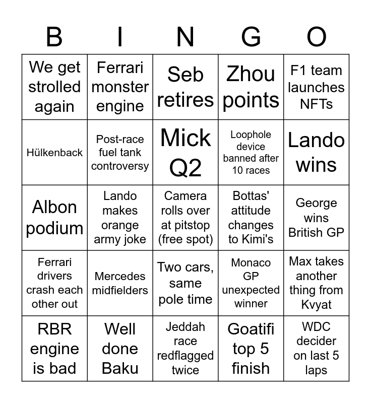 This bingo card has a free space and 24 words: Mercedes midfielders, Well done Baku, Mick Q2, RBR engine is bad, F1 team launches NFTs, We get strolled again, Hülkenback, Ferrari monster engine, Bottas' attitude changes to Kimi's, Two cars, same pole time, Loophole device banned after 10 races, Albon podium, Monaco GP unexpected winner, Max takes another thing from Kvyat, Post-race fuel tank controversy, Goatifi top 5 finish, George wins British GP, Seb retires, Lando wins, Lando makes orange army joke, WDC decider on last 5 laps, Ferrari drivers crash each other out, Zhou points and Jeddah race redflagged twice.
