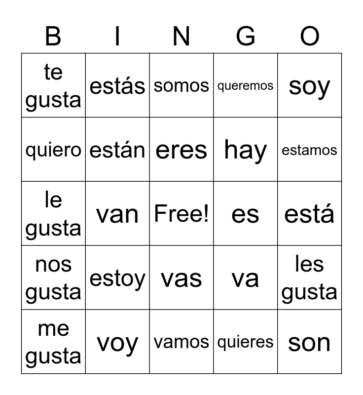 This bingo card has a free space and 24 words: estoy, voy, eres, me gusta, soy, te gusta, quiero, estás, es, vas, hay, le gusta, va, les gusta, están, quieres, está, somos, estamos, van, son, nos gusta, queremos and vamos.
