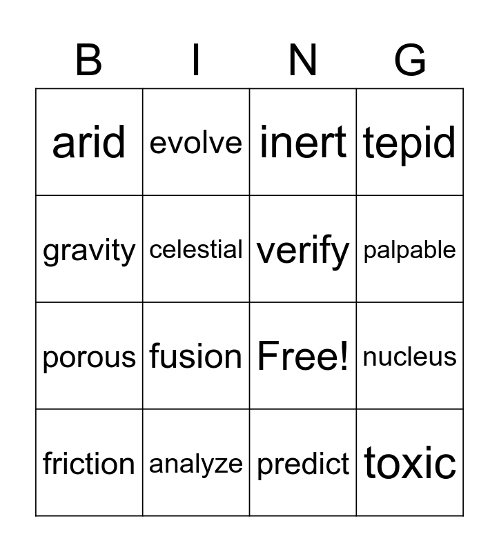 This bingo card has 21 words: analyze, conjecture, evolve, hypothesis, predict, verify, arid, inert, Free!, palpable, porous, tepid, toxic, astronomy, celestial, eclipse, friction, fusion, gravity, nucleus and orbit.