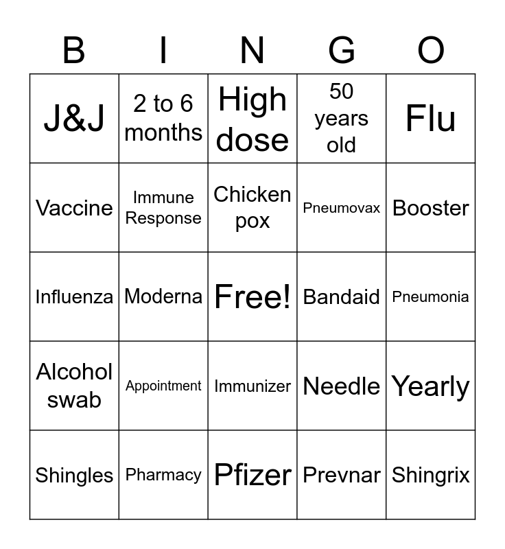 This bingo card has a free space and 29 words: Shingles, Fully Vaccinated, Moderna, Tylenol, J&J, High dose, Immune Response, Appointment, Bandaid, Pharmacy, Pneumonia, Shingrix, Pfizer, Prevnar, Booster, Immunization Carf, Immunizer, Alcohol swab, Flu, Influenza, Needle, COVID-19, Pneumovax, Vaccine, 50 years old, 2 to 6 months, Yearly, Chicken pox and Medicare.