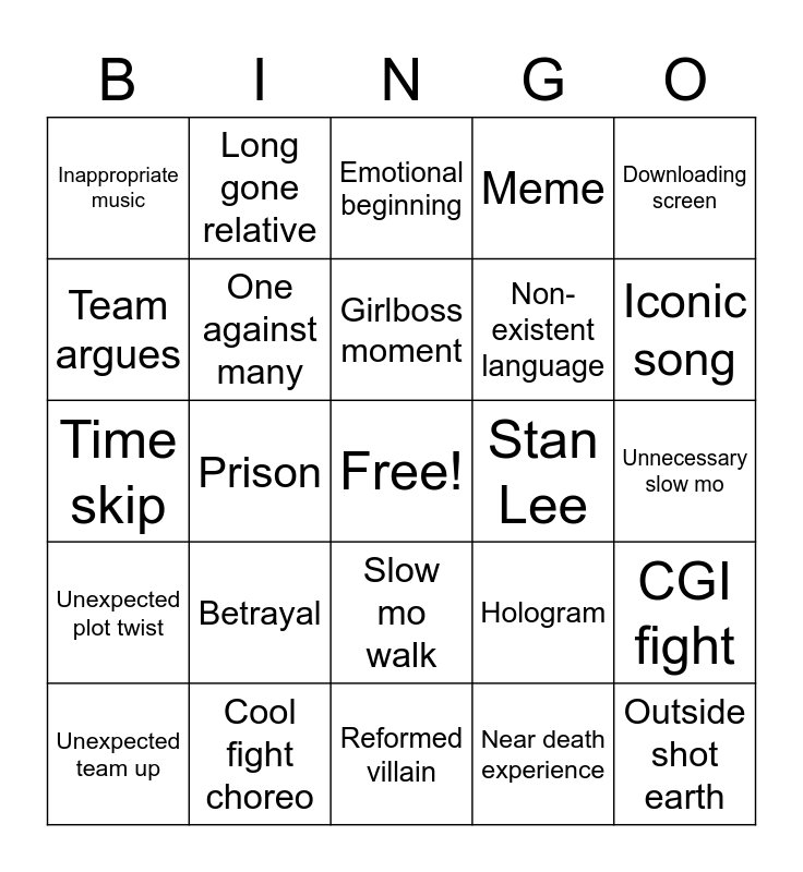 This bingo card has a free space and 27 words: Hologram, Funny joke, Non-existent language, Reformed villain, Team argues, Emotional beginning, Long gone relative, Unexpected plot twist, Stan Lee, CGI fight, Time skip, Meme, Unexpected team up, Cool fight choreo, Iconic song, Chase scene, One against many, Girlboss moment, Betrayal, Inappropriate music, Unnecessary slow mo, Near death experience, Prison, Outside shot earth, Slow mo walk, Downloading screen and Lense flare.