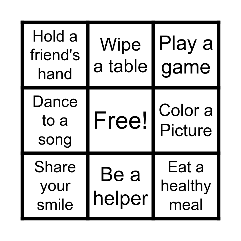 This bingo card has a free space and 8 words: Color a Picture, Play a game, Wipe a table, Share your smile, Hold a friend's hand, Eat a healthy meal, Dance to a song and Be a helper.