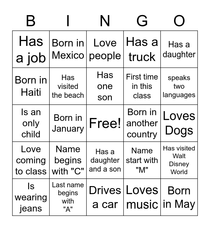 This bingo card has a free space and 24 words: Name begins with "C", Last name begins with "A", Has one son, Is wearing jeans, Has a daughter, Has a job, Born in Haiti, Born in Mexico, Born in another country, Has a daughter and a son, First time in this class, Is an only child, Name start with "M", Has visited Walt Disney World, Has visited the beach, Loves music, Loves Dogs, Love people, speaks two languages, Born in January, Born in May, Love coming to class, Has a truck and Drives a car.