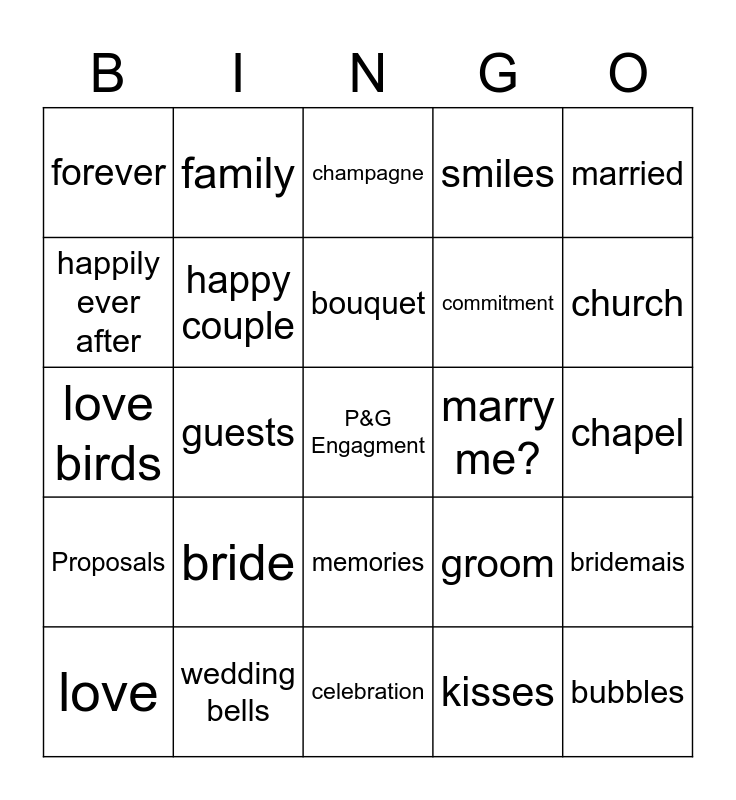 This bingo card has a free space and 34 words: rings, kisses, engaged, I do, Proposals, happy couple, married, love, family, first dance, bouquet, champagne, fiance, she said yes, marry me?, church, wedding bells, love birds, bride, groom, memories, speeches, forever, chapel, celebration, bubbles, smiles, hearts, commitment, happily ever after, happiness, guests, bridemais and groomsman.