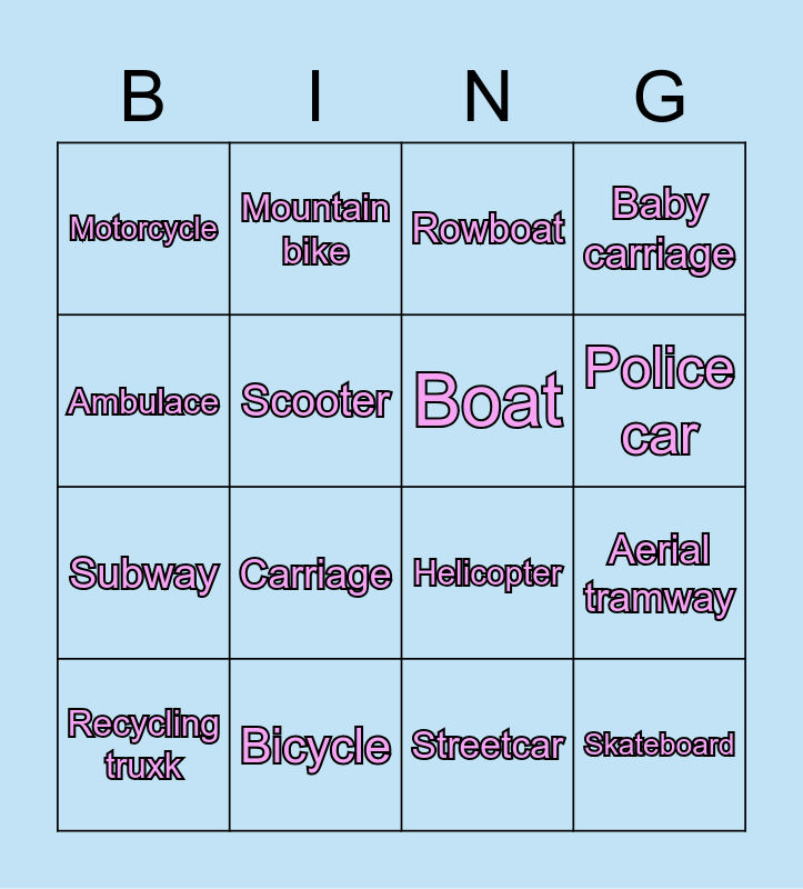 This bingo card has 24 words: Van, Taxi, Police car, Bus, Ambulace, Motorcycle, Scooter, Mountain bike, Bicycle, Tractor, Subway, Helicopter, Airplane, Balloon, Boat, Train, Streetcar, Rowboat, Carriage, Aerial tramway, Recycling truxk, Skateboard, Baby carriage and Crane.