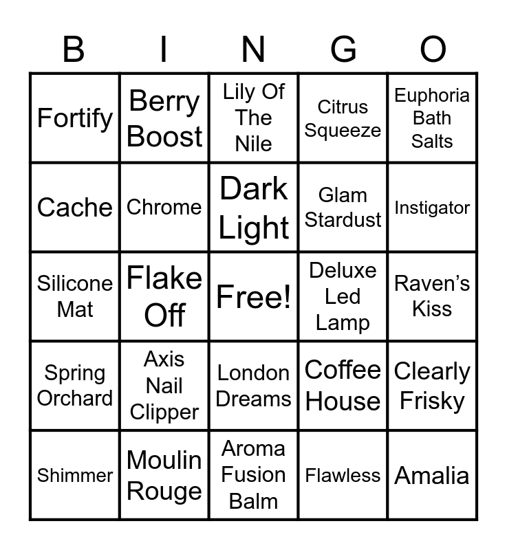 This bingo card has a free space and 50 words: Almond Oil, Amalia, Angel Kiss, Aroma Fusion Balm, Axis Nail Clipper, Beauty Queen, Berry Boost, Body Scrub, Cache, Chandelier, Chrome, Citrus Squeeze, Clearly Frisky, Coffee House, Coffee Scrub, Confidence, Dark Light, Deluxe Led Lamp, Eclipse, Euphoria Bath Salts, Flake Off, Flawless, Fortify, Glam Stardust, Glitz Captivate, Glitz Hypnotize, Instigator, Jade’s Wish, Lily Of The Nile, London Dreams, Lovee Dovee, Matte’r Effect, Mini LED Lamp, Mint To Be, Moulin Rouge, Nail Files, Nebula, Peel Off, Professional Led Lamp, Raven’s Kiss, Red Stiletto, Repair, Sailor’s Night, Second Chance, Shimmer, Silicone Mat, Silver Marlin, Spectrum, Spring Orchard and Stamping Gel.