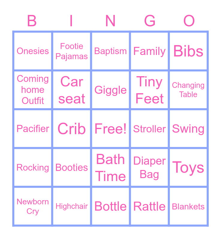 This bingo card has a free space and 29 words: Newborn Cry, Swaddle, Crib, Spit- up, Onesies, Baptism, Car seat, Booties, Stroller, Highchair, Swing, Blankets, Bottle, Rattle, Changing Table, Nursery, Bath Time, Rocking, Bibs, Pacifier, Diaper Bag, Diapers, Tiny Feet, Coming home Outfit, Family, Footie Pajamas, Toys, Giggle and Bouncer.