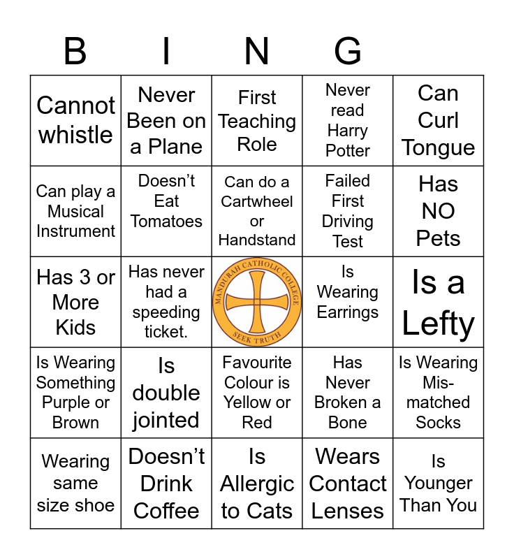 This bingo card has a free space and 29 words: Wearing same size shoe, Has a Birthday This Month, Has never had a speeding ticket., Can touch their toes, Cannot whistle, First Teaching Role, Doesn’t Eat Tomatoes, Is double jointed, Is Wearing Earrings, Doesn’t Drink Coffee, Is a Lefty, Is Younger Than You, Is Allergic to Cats, Wears Contact Lenses, Has NO Pets, Recently moved to Perth, Favourite Colour is Yellow or Red, Is Wearing Something Purple or Brown, Can Curl Tongue, Has 3 or More Kids, Has Never Broken a Bone, Was Born in the Same Month, Failed First Driving Test, Can play a Musical Instrument, Never read Harry Potter, Never Been on a Plane, Is Wearing Mis-matched Socks, Can do a Cartwheel or Handstand and Can Speak 2 or more languages.