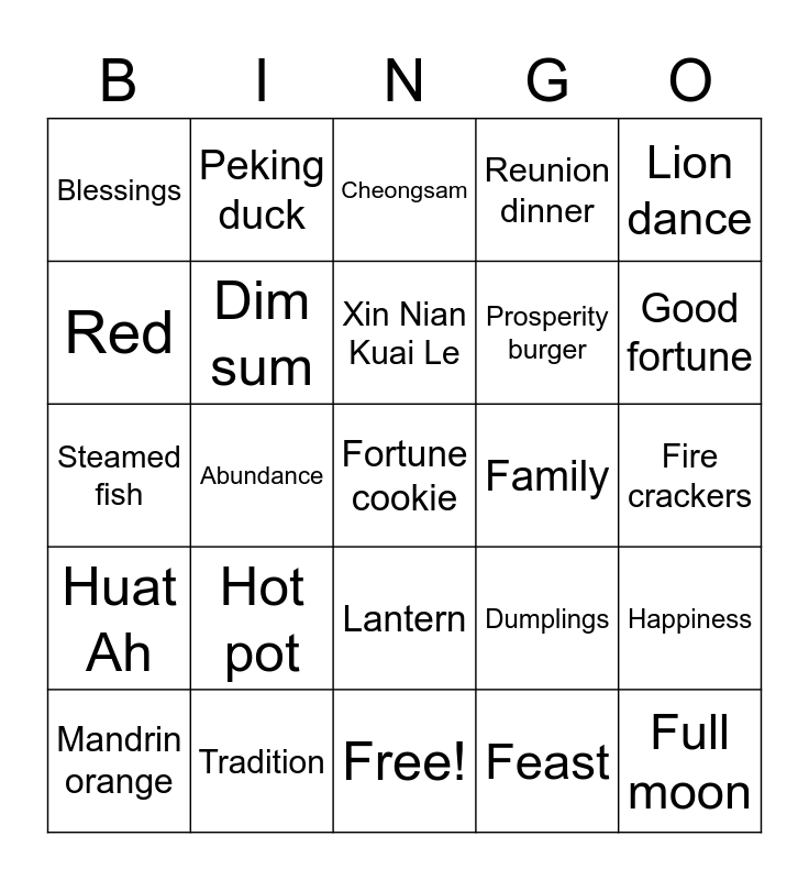 This bingo card has 31 words: Free!, 2 hari cuti, Abundance, Ang pow packet, Blessings, Cheongsam, Dim sum, Dumplings, Family, Feast, Fire crackers, Fortune cookie, Full moon, Gong Hei Fat Choy, Good fortune, Hanfu, Happiness, Hot pot, Huat Ah, Lantern, Lion dance, Lunar, Mandrin orange, Peking duck, Prosperity burger, Red, Reunion dinner, Steamed fish, Tradition, Xin Nian Kuai Le and Year of Tiger.