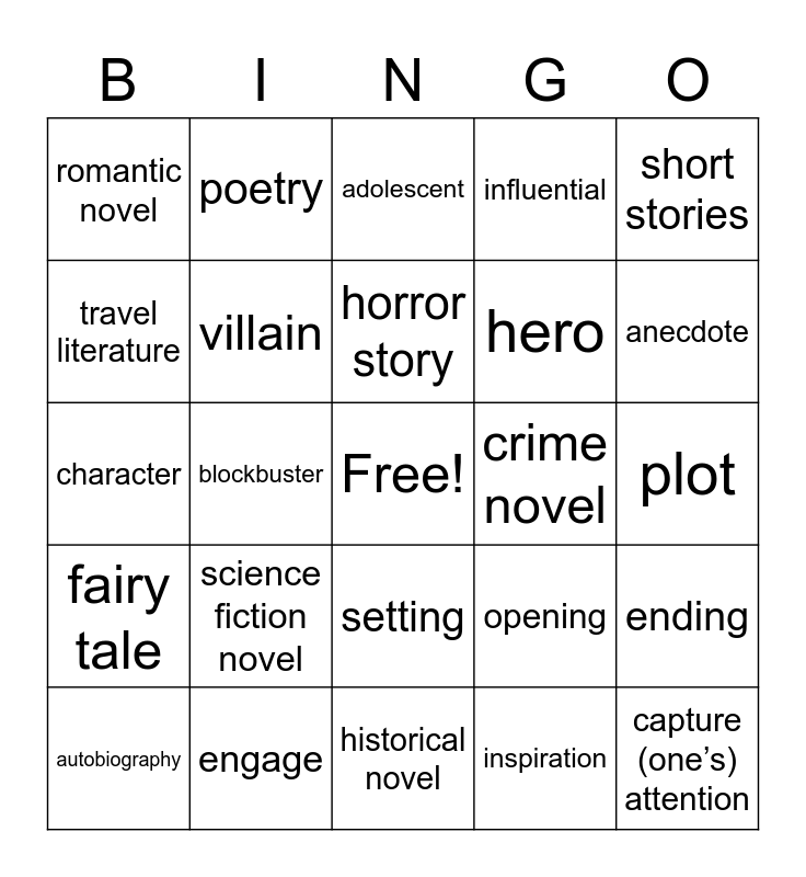 This bingo card has a free space and 25 words: science fiction novel, historical novel, horror story, autobiography, short stories, romantic novel, travel literature, poetry, crime novel, setting, hero, character, opening, ending, villain, dialogue, plot, adolescent, anecdote, blockbuster, capture (one’s) attention, engage, fairy tale, influential and inspiration.