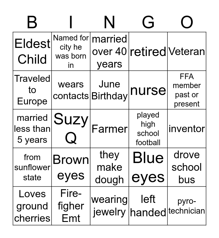 This bingo card has a free space and 24 words: Brown eyes, Fire-figher Emt, June Birthday, Loves ground cherries, Veteran, Eldest Child, Traveled to Europe, Named for city he was born in, played high school football, they make dough, nurse, married less than 5 years, Blue eyes, drove school bus, wears contacts, left handed, inventor, married over 40 years, FFA member past or present, Suzy Q, pyro-technician, from sunflower state, retired and wearing jewelry.