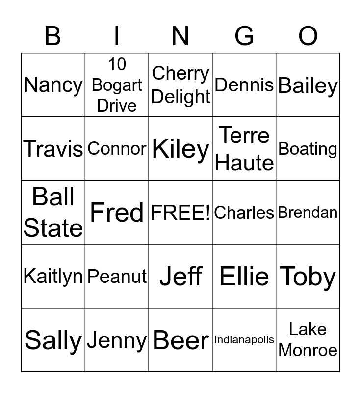 This bingo card has a free space and 49 words: Pot Salad, Lake Monroe, Petri, Beer, Peanut, Andy, 10 Bogart Drive, Riley, Travis, B-Town, Connor, Dennis, Toby, Ellie, Hannah, Mr. Biggs, Kiley, Charles, Buddy, Bailey, Fred, Indianapolis, Nancy, Terre Haute, Pool, Boating, Sally, Tucson, Jeff, Kaitlyn, Downers Grove, Major, Matt, Megan, Jenny, Lucas, Cathy, Beau, Brendan, IU, Purdue, IUPUI, ISU, Ivy Tech, Ball State, Cherry Delight, Bazzel, Root Beer Float and Ivy Tech.