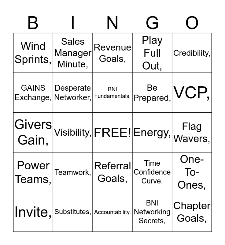 This bingo card has a free space and 42 words: Fast Track,, BNI Fundamentals,, Curriculum,, Teamwork,, BNI Networking Secrets,, One-To-Ones,, Chapter Goals,, Member Goals,, Revenue Goals,, Referral Goals,, Flag Wavers,, VCP,, Visibility,, Credibility,, Profitability,, Time Confidence Curve,, Trust Point,, Givers Gain,, Touch Points,, Sales Manager Minute,, GAINS Exchange,, Business By Referral,, Attendance Policy,, Wind Sprints,, Weekly Meetings,, Target Market,, Be Prepared,, Sales Force,, Laser Specific,, LCD’s,, Contact Spheres,, Power Teams,, Desperate Networker,, Accountability,, Visitors,, Invite,, Substitutes,, Energy,, Participation,, Be On Time,, Play Full Out, and Positive Attitude,.