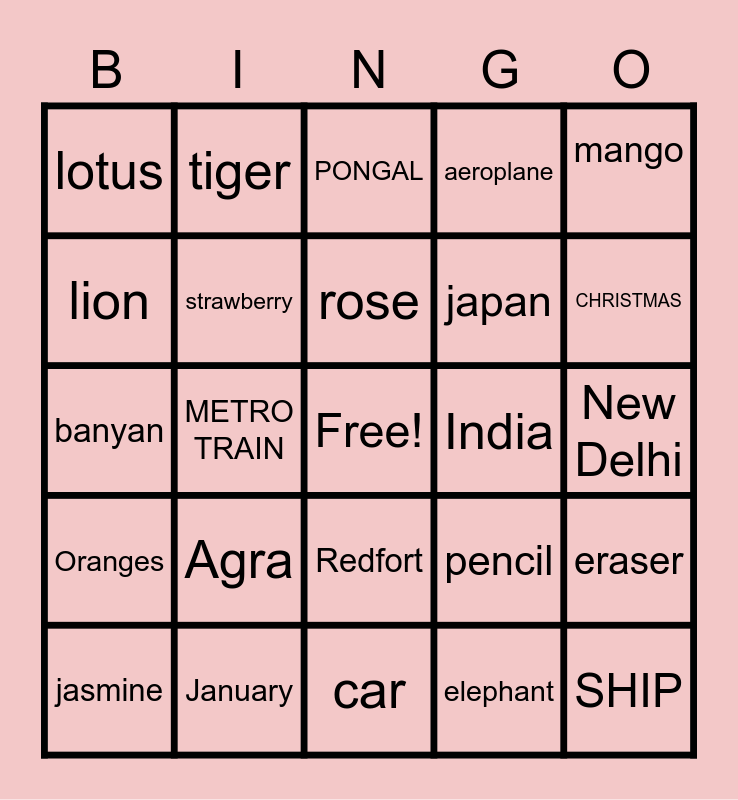 This bingo card has a free space and 24 words: Agra, January, rose, jasmine, mango, lotus, lion, tiger, India, Redfort, japan, banyan, pencil, eraser, strawberry, elephant, New Delhi, PONGAL, CHRISTMAS, METRO TRAIN, SHIP, Oranges, aeroplane and car.