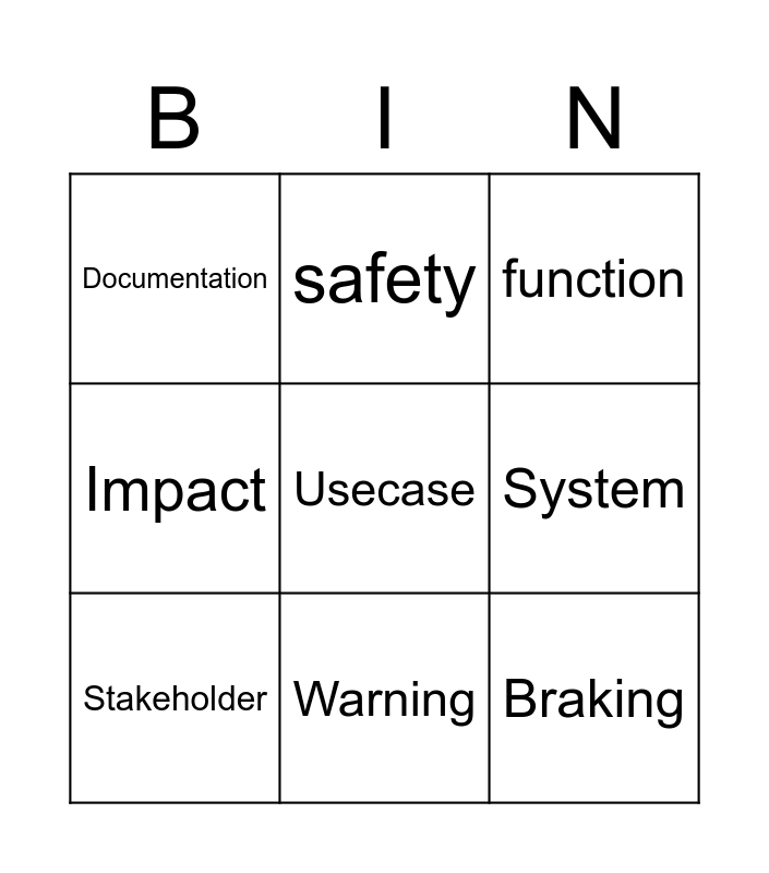 This bingo card has a free space and 8 words: System, function, safety, Stakeholder, Documentation, Braking, Impact and Warning.