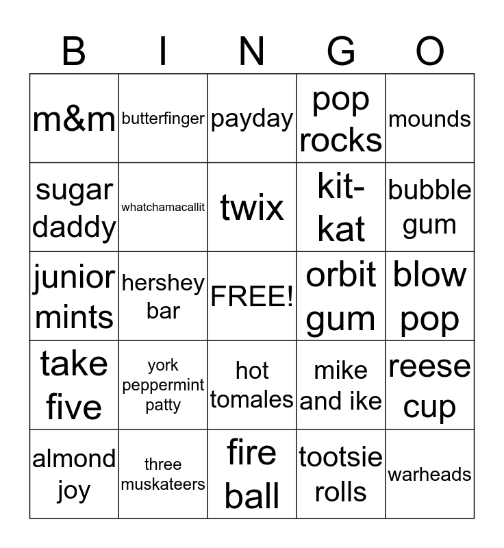 This bingo card has a free space and 34 words: snickers, tootsie rolls, jelly beans, caramello, take five, whatchamacallit, mounds, almond joy, butterfinger, milky way, twix, payday, baby ruth, whoppers, orbit gum, bubble gum, three muskateers, junior mints, york peppermint patty, mike and ike, hot tomales, swedish fish, m&m, blow pop, fire ball, warheads, pop rocks, hershey's kiss, kit-kat, sugar daddy, fun dip, hershey bar, reese cup and reese's pieces.