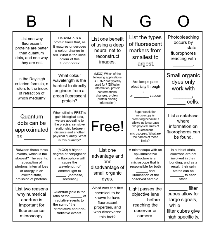 This bingo card has a free space and 24 words: (MCQ) A higher degree of conjugation in a fluorophore will cause the wavelength of emitted light to _____. [Increase, Decrease], Quantum yield is the ratio of the ______ of radiative events to the sum of the _____ of radiative and non-radiative events., (MCQ) Which of the following applications is FRAP not typically used for? (Diffusion information, protein conformational changes, protein-protein binding information), List two reasons why numerical aperture is important for fluorescence microscopy., Photobleaching occurs by ______ state fluorophores reacting with ________., List one way fluorescent proteins are better than quantum dots, and one way they are not., In the Rayleigh criterion formula, n refers to the index of refraction of which medium?, DsRed-E5 is a protein timer that, as it matures undergoes a colour change to red. What is the initial colour of this fluorophore?, Super resolution microscopy is promising because it allows us to surpass two physical limits of fluorescent microscopes. What are the names of these limits?, List one advantage and one disadvantage of small organic dyes., Arc lamps pass electricity through ______, _______, or _______ vapour, Quantum dots can be approximated as _______., A microscope with an epi-illuminative structure is a microscope that is responsible for both ______ and illumination of the observed sample., In a triplet state, electrons are not involved in their bonding, and as a result, their spin states can be _______ to each other., What colour wavelength is the hardest to directly engineer from a green fluorescent protein?, Light passes the objective lens ______ before reaching the observer or camera., List a database where information on fluorophores can be found., List one benefit of using a deep neural net to reconstruct images., Small organic dyes only work with ______, ______ cells., When utilising FRET to gain biological data, we are appealing to the precise, sensitive relationship between distance and another physical quantity. What is this quantity?, _______ filter cubes allow for large signals, while ______ filter cubes give high specificity., Between these three events, which is the slowest? The events: absorption of photons, internal loss of energy in an excited state, emission of photons., List the types of fluorescent markers from smallest to largest. and What was the first chemical to be known to have fluorescent properties, and who discovered this fact?.