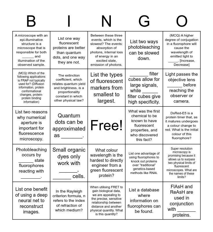This bingo card has a free space and 24 words: Small organic dyes only work with ______, ______ cells., In the Rayleigh criterion formula, n refers to the index of refraction of which medium?, List the types of fluorescent markers from smallest to largest., List one benefit of using a deep neural net to reconstruct images., (MCQ) A higher degree of conjugation in a fluorophore will cause the wavelength of emitted light to _____. [Increase, Decrease], A microscope with an epi-illuminative structure is a microscope that is responsible for both ______ and illumination of the observed sample., (MCQ) Which of the following applications is FRAP not typically used for? (Diffusion information, protein conformational changes, protein-protein binding information), List one way fluorescent proteins are better than quantum dots, and one way they are not., What was the first chemical to be known to have fluorescent properties, and who discovered this fact?, What colour wavelength is the hardest to directly engineer from a green fluorescent protein?, _______ filter cubes allow for large signals, while ______ filter cubes give high specificity., List two reasons why numerical aperture is important for fluorescence microscopy., List one advantage of using fluorophores to knock out proteins over “traditional” genetics-based methods like RNAi., Super resolution microscopy is promising because it allows us to surpass two physical limits of fluorescent microscopes. What are the names of these limits?, The extinction coefficient, which relates quantum yield and brightness, is a proportionality constant in which other physical law?, List a database where information on fluorophores can be found., DsRed-E5 is a protein timer that, as it matures undergoes a colour change to red. What is the initial colour of this fluorophore?, Between these three events, which is the slowest? The events: absorption of photons, internal loss of energy in an excited state, emission of photons., Light passes the objective lens ______ before reaching the observer or camera., Quantum dots can be approximated as _______., FlAsH and ReAsH are used in conjunction with _______ proteins., Photobleaching occurs by ______ state fluorophores reacting with ________., List two ways photobleaching can be slowed down. and When utilising FRET to gain biological data, we are appealing to the precise, sensitive relationship between distance and another physical quantity. What is this quantity?.