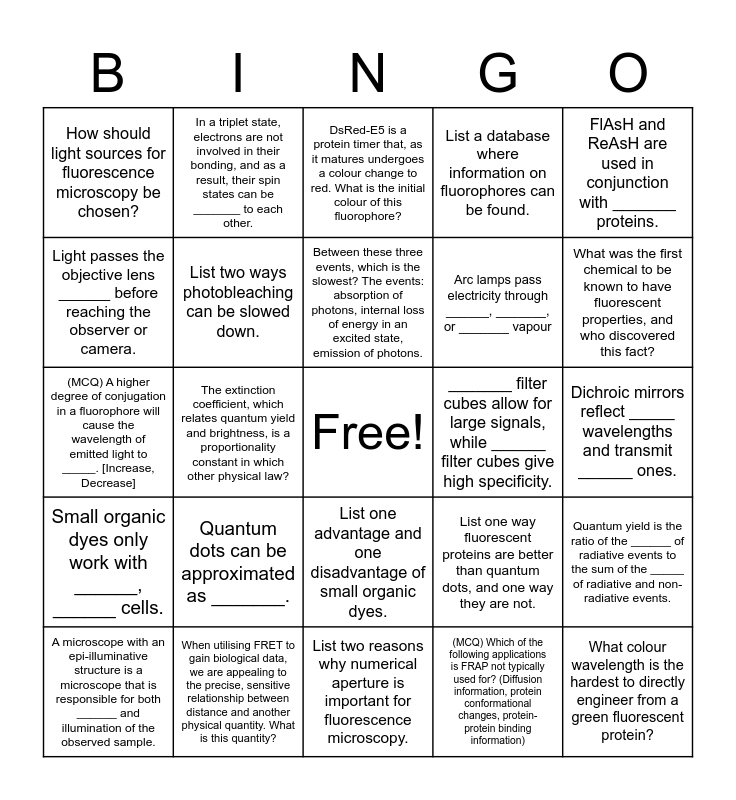 This bingo card has a free space and 24 words: Quantum dots can be approximated as _______., When utilising FRET to gain biological data, we are appealing to the precise, sensitive relationship between distance and another physical quantity. What is this quantity?, Between these three events, which is the slowest? The events: absorption of photons, internal loss of energy in an excited state, emission of photons., A microscope with an epi-illuminative structure is a microscope that is responsible for both ______ and illumination of the observed sample., FlAsH and ReAsH are used in conjunction with _______ proteins., How should light sources for fluorescence microscopy be chosen?, Light passes the objective lens ______ before reaching the observer or camera., In a triplet state, electrons are not involved in their bonding, and as a result, their spin states can be _______ to each other., _______ filter cubes allow for large signals, while ______ filter cubes give high specificity., List one advantage and one disadvantage of small organic dyes., Arc lamps pass electricity through ______, _______, or _______ vapour, (MCQ) A higher degree of conjugation in a fluorophore will cause the wavelength of emitted light to _____. [Increase, Decrease], List one way fluorescent proteins are better than quantum dots, and one way they are not., Quantum yield is the ratio of the ______ of radiative events to the sum of the _____ of radiative and non-radiative events., List two ways photobleaching can be slowed down., (MCQ) Which of the following applications is FRAP not typically used for? (Diffusion information, protein conformational changes, protein-protein binding information), Dichroic mirrors reflect _____ wavelengths and transmit ______ ones., DsRed-E5 is a protein timer that, as it matures undergoes a colour change to red. What is the initial colour of this fluorophore?, What was the first chemical to be known to have fluorescent properties, and who discovered this fact?, The extinction coefficient, which relates quantum yield and brightness, is a proportionality constant in which other physical law?, What colour wavelength is the hardest to directly engineer from a green fluorescent protein?, Small organic dyes only work with ______, ______ cells., List a database where information on fluorophores can be found. and List two reasons why numerical aperture is important for fluorescence microscopy..