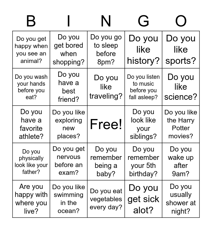 This bingo card has a free space and 24 words: Do you get nervous before an exam?, Do you like swimming in the ocean?, Do you like traveling?, Are you happy with where you live?, Do you like sports?, Do you get happy when you see an animal?, Do you wash your hands before you eat?, Do you get bored when shopping?, Do you look like your siblings?, Do you remember being a baby?, Do you listen to music before you fall asleep?, Do you have a favorite athlete?, Do you remember your 5th birthday?, Do you wake up after 9am?, Do you have a best friend?, Do you get sick alot?, Do you like the Harry Potter movies?, Do you go to sleep before 8pm?, Do you like science?, Do you like exploring new places?, Do you usually shower at night?, Do you physically look like your father?, Do you like history? and Do you eat vegetables every day?.