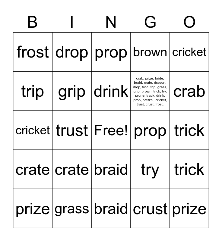 This bingo card has a free space and 48 words: crab, prize, bride, braid, crate, dragon, drop, tree, trip, grass, grip, brown, trick, try, prune, track, drink, prop, pretzel, cricket, trust, crust, frost, crab, prize, bride, braid, crate, dragon, drop, tree, trip, grass, grip, brown, trick, try, prune, track, drink, prop, pretzel, cricket, trust, crust, frost,, cream, dream, crab, prize, bride, braid, crate, dragon, drop, tree, trip, grass, grip, brown, trick, try, prune, track, drink, prop, pretzel, cricket, trust, crust and frost.
