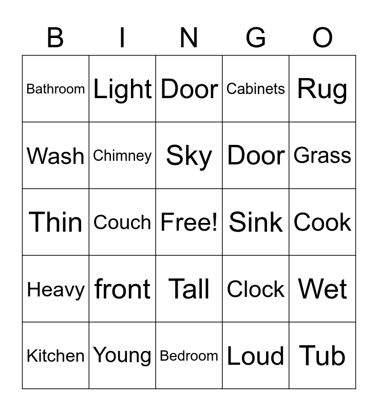 This bingo card has a free space and 57 words: House, Kitchen, Living Room, Bathroom, Bedroom, Yard, Chimney, Roof, Door, Window, Cabinets, Chair, Table, Stove, Curtains, Lamp, Rug, Couch, Mirror, Tub, Sink, Floor, Clock, Door, Pillow, Sky, Fence, Tree, Grass, Make the bed, Sweep, Set the table, Wipe, Mop, Cook, Wash, Vacuum, Thin, Thick, Heavy, Light, Tall, Short, Hard, Soft, back, front, Young, Old, Slow, Fast, Loud, Quiet, Big, Small, Wet and Dry.