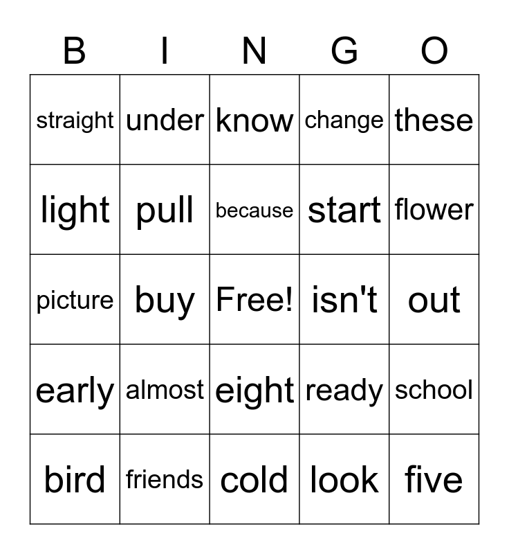 This bingo card has a free space and 24 words: almost, friends, because, bird, these, straight, light, under, isn't, eight, start, picture, ready, school, pull, look, out, know, flower, buy, five, early, change and cold.