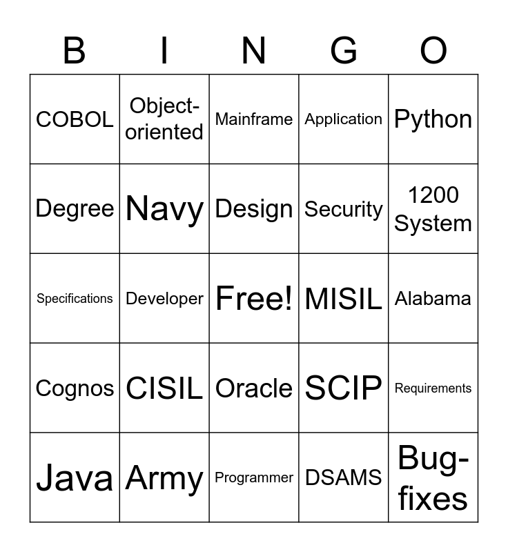 This bingo card has a free space and 29 words: Java, Analyst, Developer, College, COBOL, Mainframe, Navy, CISIL, MISIL, Army, Alabama, Bug-fixes, Programmer, DSAMS, 1200 System, Database, Oracle, Cognos, Python, Specifications, SCIP, Cloud, Security, Degree, Application, Object-oriented, Requirements, Design and Troubleshooting.
