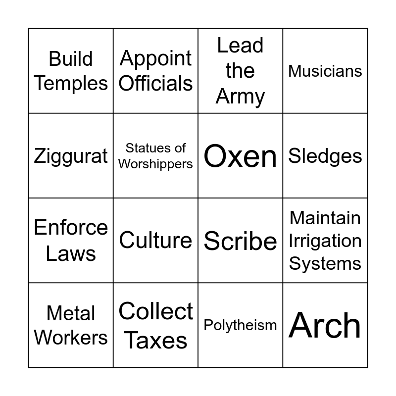 This bingo card has 16 words: Collect Taxes, Maintain Irrigation Systems, Lead the Army, Build Temples, Enforce Laws, Appoint Officials, Scribe, Polytheism, Ziggurat, Statues of Worshippers, Metal Workers, Musicians, Culture, Sledges, Oxen and Arch.