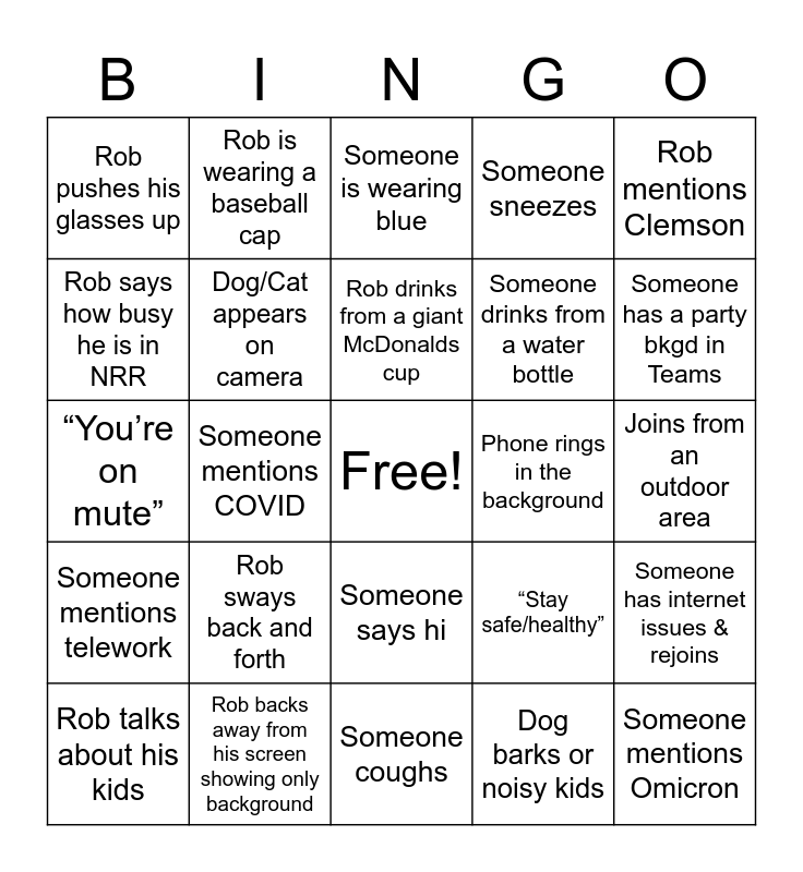 This bingo card has a free space and 24 words: Rob sways back and forth, Rob backs away from his screen showing only background, Rob drinks from a giant McDonalds cup, Rob talks about his kids, Rob mentions Clemson, Rob pushes his glasses up, Rob says how busy he is in NRR, Rob is wearing a baseball cap, Phone rings in the background, Someone says hi, Someone drinks from a water bottle, “You’re on mute”, “Stay safe/healthy”, Someone has internet issues & rejoins, Dog/Cat appears on camera, Dog barks or noisy kids, Joins from an outdoor area, Someone is wearing blue, Someone has a party bkgd in Teams, Someone mentions COVID, Someone mentions Omicron, Someone mentions telework, Someone sneezes and Someone coughs.