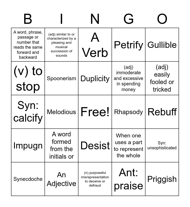 This bingo card has a free space and 39 words: Anagram, Acronym, Palindrome, Spoonerism, Synecdoche, Desist, Duplicity, Extravagant, Gullible, Impugn, Melodious, Petrify, Priggish, Rebuff, Rhapsody, A word formed from the initials or, other parts of several words, A word, phrase, passage or number that reads the same forward and backward, Is the shuffling of the first letters of words to make different words and therefore change the actual meaning of the sentence, or else produce a humorous, nonsensical sound., When one uses a part to represent the whole, (v) to stop, (n) purposeful misrepresentation to deceive or defraud, (adj) immoderate and excessive in spending money, (adj) easily fooled or tricked, (v) to challenge or attack an idea or statement as being untrue, especially to bring up arguments or facts against an idea or statement, (v) to cause to become hardened or stone like, (adj) excessively conceited or snobbish, (n) an expression of exaltation or elation in writing or speech, (n) a refusal or rejection, especially one that is unexpected, harsh, or abrupt, (adj) similar to or characterized by a pleasing and musical succession of sounds, Syn: poetry, A Noun, A Verb, An Adjective, Ant: praise, Ant: discordant, Syn: unsophisticated, Syn: calcify and Ant: complete.