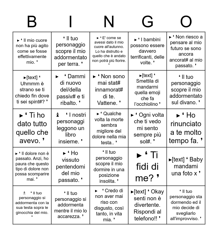 This bingo card has 169 words: ▸ ❛ Hai detto che ci avresti provato. ❜, ▸ ❛ No, tu SEI forte! ❜, ▸ ❛ Me l'hai promesso! ❜, ▸ ❛ Va bene. Non mi vedrai mai più, okay? ❜, ▸ ❛ Ti ho dato tutto quello che avevo. ❜, ▸ ❛ I tuoi occhi sono così crudeli… ❜, ▸ ❛ Non riesco mai a fare niente di giusto, vero? ❜, ▸ ❛ Rivoglio la mia vita indietro. ❜, ▸ ❛ Smettila di piangere. ❜, ▸ ❛ Dovresti andartene. ❜, ▸ ❛ Non tornare indietro. ❜, ▸ ❛ Ferirmi ti fa sentire bene o cosa? ❜, ▸ ❛ Non sono mai stat# innamorat# di te. Vattene. ❜, ▸ ❛ E' ovvio che fosse importante. ❜, ▸ ❛ Qualche volta la morte sembra migliore del dolore nella mia testa.. ❜, ▸ ❛ A volte, per rimanere in vita, devi uccidere la tua stessa testa. ❜, ▸ ❛ Delle volte devi sanguinare per ricordarti che sei vivo, che hai un'anima, ma spesso c'è bisogno di qualcuno che sia pronto a farti vivere. ❜, ▸ ❛ Alzati, devi fare soldi!. ❜, ▸ ❛ Mentre tu te la stai passando meglio ci sono altre persone, io compres#, che stanno facendo fatica a vivere la giornata. ❜, ▸ ❛ Wow. Avrei fatto meglio a rimanere in casa. ❜, ▸ ❛ Sì, penso alla fine fin troppe volte... ma è divertente lasciar spaziare la fantasia. ❜, ▸ ❛ HO UN INSETTO ADDOSSO! TOGLILO! ❜, ▸ ❛ C'è qualcosa che non abbiamo ancora mangiato? ❜, ▸ ❛ Guarda! Conigli! ❜, ▸ ❛ Abbiamo finito ora? ❜, ▸ ❛ Quel corn dog non mi sembra molto stabile... ❜, ▸ ❛ Quella band è orribile. Wow. ❜, ▸ ❛ No, mi scoccio. Buona continuazione. ❜, ▸ ❛ Occhio non vede, disturbo ossessivo compulsivo non duole. ❜, ▸ ❛ Feccia. ❜, ▸ ❛ Prendetevi una stanza! ❜, ▸ ❛ Smettila di essere nella mia testa! ❜, ▸ ❛ Dammi di nuovo del/della passiv# e ti ribalto. ❜, ▸ ❛ Sono scioccobasit#. ❜, ▸ ❛ Credo di non aver mai riso con disgusto, così tanto, in vita mia. ❜, ▸ ❛ Allora: chi viene con me a saccheggiare l'area 51? ❜, ▸[text] ❛ [meme per quarantenni, in chat di gruppo, alle sei del mattino] ❜, ▸[text] ❛ Perché non sono nel canale NSFW del tuo server Discord?! ❜, ▸[text] ❛ YouTube vuole farmi per forza ascoltare "Bury a Friend". MI FA PAURA QUEL VIDEO. ❜, ♔ ❛ Il mio personaggio scopre il tuo ad indossare i suoi vestiti. ❜, ♕ ❛ I nostri personaggi si tengono le mani. ❜, ♖ ❛ Il mio personaggio si fa lavare i capelli dal tuo. ❜, ♗ ❛ Il tuo personaggio si addormenta con la sua testa sopra le ginocchia del mio. ❜, ♘ ❛ I nostri personaggi si coccolano in una fortezza di cuscini. ❜, ♙ ❛ I nostri personaggi condividono il letto. ❜, ♚ ❛ Il mio personaggio fa i grattini alla testa del tuo. ❜, ♛ ❛ I nostri personaggi condividono il dessert. ❜, ♜ ❛ Il mio personaggio fa un massaggio alle spalle del tuo. ❜, ♝ ❛ I nostri personaggi leggono un libro insieme. ❜, ♞ ❛ I nostri personaggi si prendono cura per una malattia (specificare quale parte) ❜, ♟ ❛ Il mio personaggio cura una ferita al tuo. ❜, ▸ ❛ Per piacere, sii gentile con quella porta! ❜, ▸ ❛ I bambini possono essere davvero terrificanti, delle volte. ❜, ▸ ❛ Non capisci, vero?! ❜, ▸ ❛ Non fa mai male chiedere! ❜, ▸ ❛ Mi piaci così tanto che ti mangerei per cena. ❜, ▸ ❛ Il tempo certamente ci ride in faccia, huh? ❜, ▸ ❛ Ho vissuto pentendomi del mio passato. ❜, ▸ ❛ Non tradire le mie aspettative. ❜, ▸ ❛ Dovevi davvero essere così sincer#? ❜, ▸ ❛ Ogni volta che ti vedo mi sento sempre più sol#. ❜, ▸ ❛ Tu mi hai cambiat#. ❜, ▸ ❛ Era tutto un gioco per te? ❜, ▸ ❛ Non lo voglio sapere. ❜, ▸ ❛ Possiamo ricominciare da capo? ❜, ▸ ❛ Mi fai sentire così insicur#. ❜, ▸ ❛ Non so se posso amarti. ❜, ▸ ❛ Ogni volta che mi sveglio ti cerco… ma tu non sei mai qui. ❜, ▸ ❛ Smettila di urlare! ❜, ▸ ❛ Ho rinunciato a te molto tempo fa. ❜, ▸ ❛ Credi che m'importi di te? Che cosa carina. ❜, ▸ ❛ Ti sei dimenticat# di me o cosa? ❜, ▸ ❛ Ho ancora bisogno di te. ❜, ▸ ❛ Vorrei dire che c'è ancora speranza, ma delle volte le cose non vanno nella giusta direzione. ❜, ▸ ❛ Aahhh, come un serpente che lascia la muta dietro di sé! ❜, ▸ ❛ Quel posto è così vuoto e silenzioso. ❜, ▸ ❛ Si può casi sentire il suono delle foglie morte che cadono per terra! ❜, ▸ ❛ Butta quel muso lungo! ❜, ▸ ❛ Non ti rende felice tutto questo? ❜, ▸ ❛ Il mio intero corpo è pervaso dal brivido dell'eccitazione! ❜, ▸ ❛ Quindi, è così che si sente la gioia pura! ❜, ▸ ❛ Puoi anche smetterla di essere sorpres#, ora! ❜, ▸ ❛ Sento solo il bisogno di fare un regalo a qualcuno. ❜, ▸ ❛ Beh, se ti piacese il puro horror, forse riusciresti a gestire tutto questo. ❜, ▸ ❛ Posso assicurarti che quel/quella ragazz# è ossessionat#! ❜, ▸ ❛ Non puoi rivelare ogni segreto! ❜, ▸ ❛ Non toccarmi con quelle mani schifose, essere immondo! ❜, ▸ ❛ Sono così compiaciut# di sentire quel nome! ❜, ❛ Il tuo personaggio si addormenta mentre il mio lo accarezza. ❜, ❛ Il tuo personaggio sta dormendo ed il mio decide di svegliarlo all'improvviso. ❜, ❛ Il tuo personaggio scopre il mio dormire abbracciato ad un peluche. ❜, ❛ Il tuo personaggio si addormenta guardando la televisione. ❜, ❛ Il tuo personaggio trova il mio addormentato dopo una lunga giornata di allenamento. ❜, ❛ Il tuo personaggio scopre il mio personaggio addormentato sul suo letto. ❜, ❛ Il tuo personaggio scopre il mio addormentato sul divano. ❜, ❛ Il tuo personaggio scopre il mio addormentato per terra. ❜, ❛ Il tuo personaggio scopre il mio dormire in una posizione insolita. ❜, ▸[text] ❛ 6 mlt sexy. ❜, ▸[text] ❛ Peccato che tu sia così lontana. Potevi sederti sulla mia faccia. ❜, ▸[text] ❛ Quella bocca sa fare anche altro? ❜, 