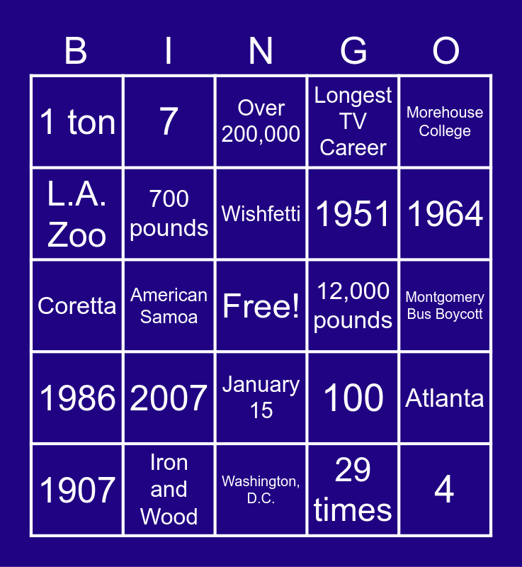 This bingo card has a free space and 29 words: 1907, Auld Lang Syne, American Samoa, 360 million glasses, 1 ton, Over 200,000, 700 pounds, 2007, 12,000 pounds, Iron and Wood, Montgomery Bus Boycott, 4, Washington, D.C., 29 times, 1964, Michael, January 15, 1986, Morehouse College, Coretta, 100, Marion, 1951, L.A. Zoo, Longest TV Career, 7, Atlanta, Wishfetti and Over 900.