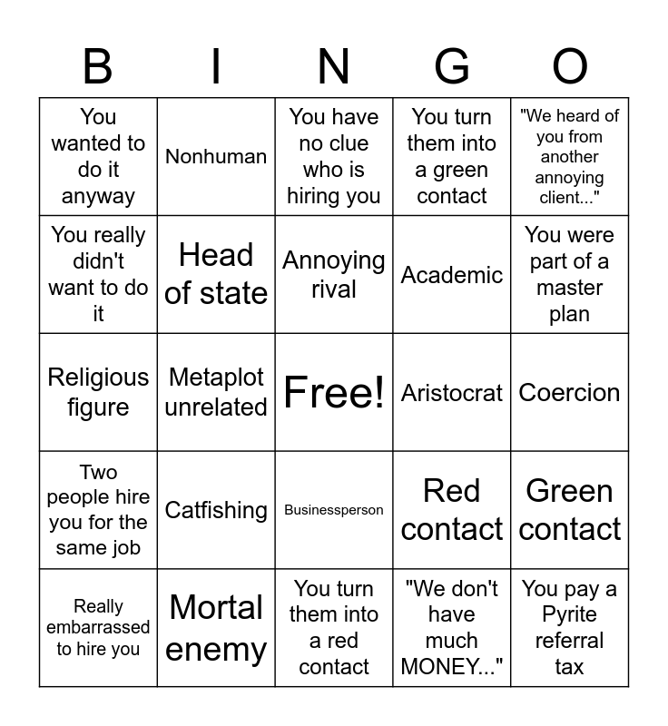 This bingo card has a free space and 24 words: Catfishing, Mortal enemy, Annoying rival, Really embarrassed to hire you, "We heard of you from another annoying client...", You wanted to do it anyway, You really didn't want to do it, Nonhuman, Aristocrat, Businessperson, Academic, Religious figure, Red contact, Green contact, Head of state, "We don't have much MONEY...", Coercion, You have no clue who is hiring you, You were part of a master plan, Metaplot unrelated, You pay a Pyrite referral tax, Two people hire you for the same job, You turn them into a green contact and You turn them into a red contact.