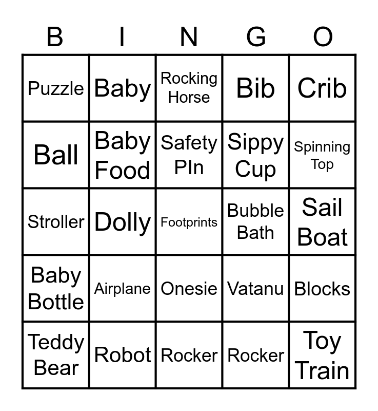 This bingo card has 25 words: Airplane, Rocker, Safety PIn, Teddy Bear, Crib, Puzzle, Ball, Baby, Bubble Bath, Onesie, Sippy Cup, Stroller, Vatanu, Blocks, Baby Food, Toy Train, Sail Boat, Rocking Horse, Spinning Top, Dolly, Footprints, Robot, Baby Bottle, Bib and Rocker.