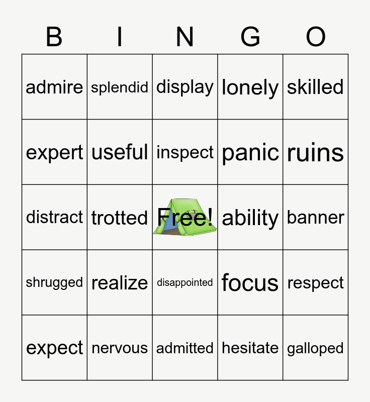 This bingo card has a free space and 24 words: realize, nervous, inspect, expect, skilled, admire, expert, splendid, ability, disappointed, panic, distract, focus, respect, useful, hesitate, banner, display, ruins, trotted, galloped, shrugged, lonely and admitted.